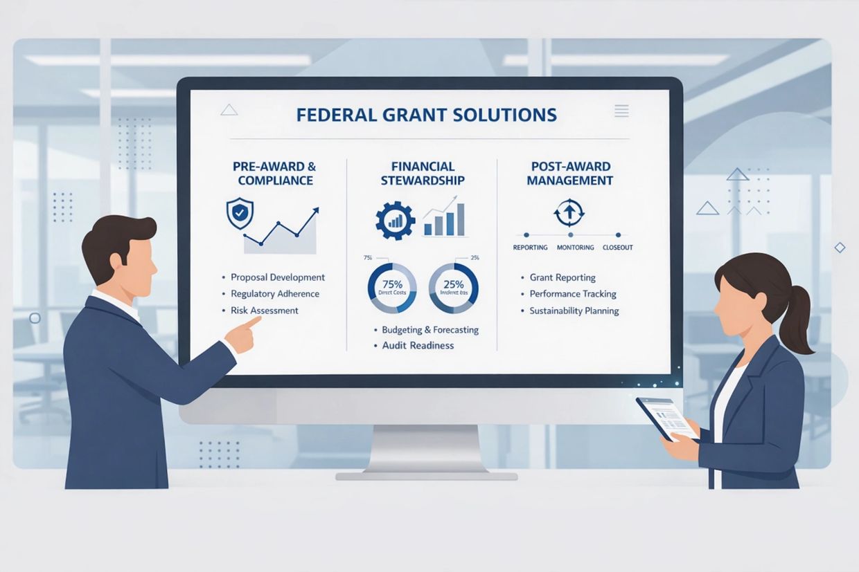 Our work is grounded in a simple belief: compliance issues rarely come from a single mistake. They stem from systems that were never designed for federal requirements. We help you identify those gaps early, address the root cause, and implement practical processes that align with post‑award expectations.
